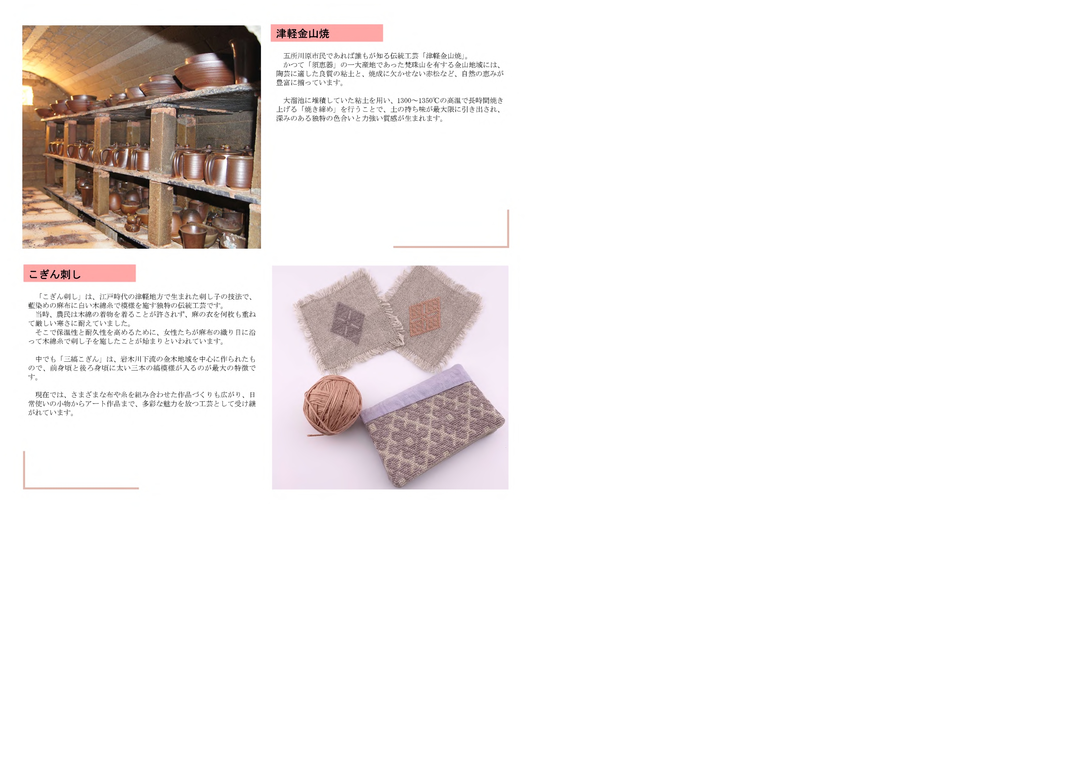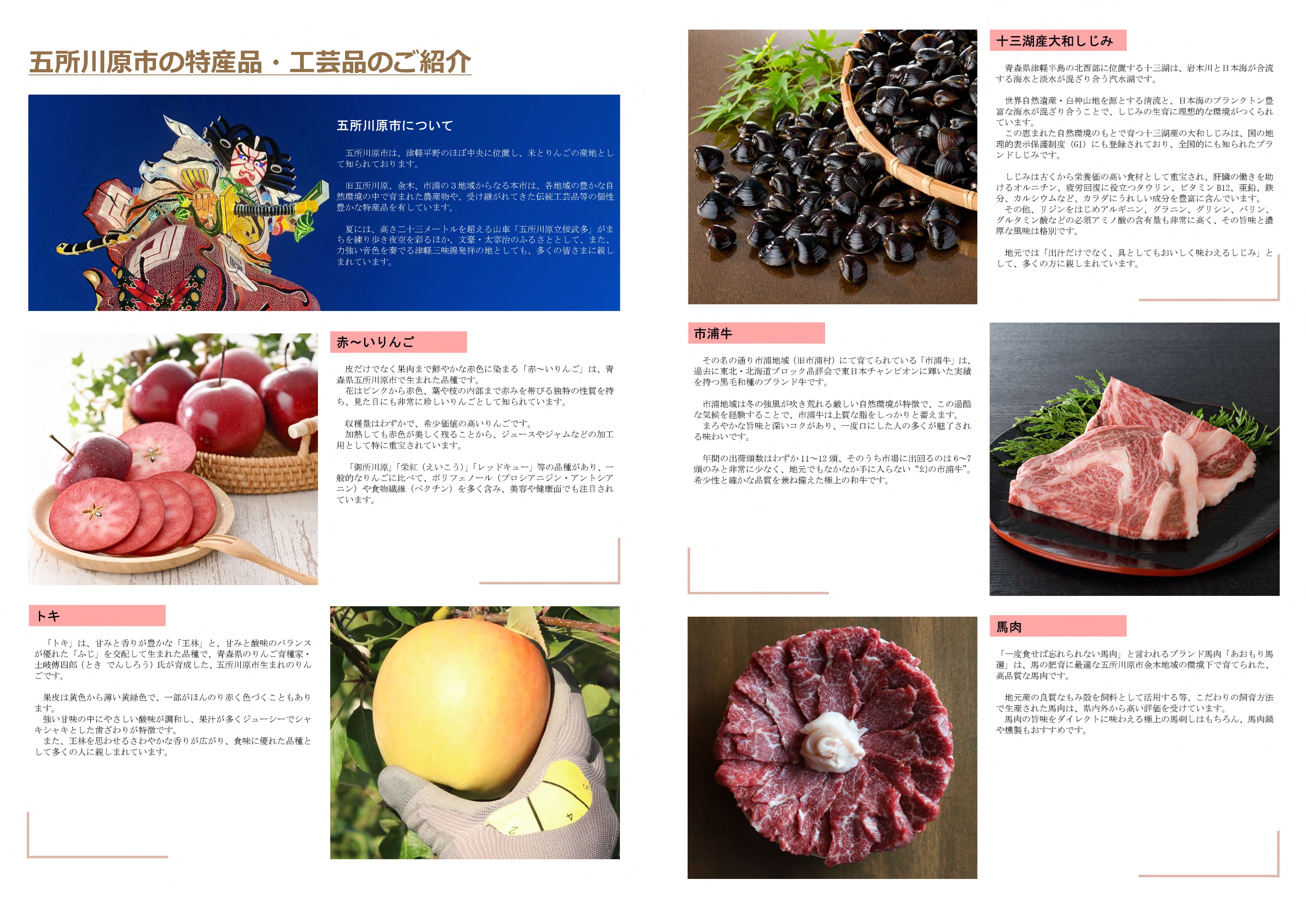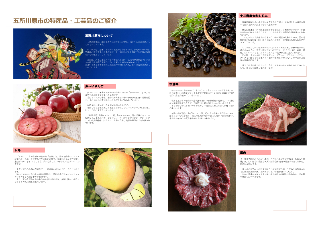 旧五所川原、金木、市浦の3地域からなる本市は、各地域の豊かな自然環境の中で育まれた農産物や、受け継がれてきた伝統工芸品等の個性豊かな特産品を有しています。