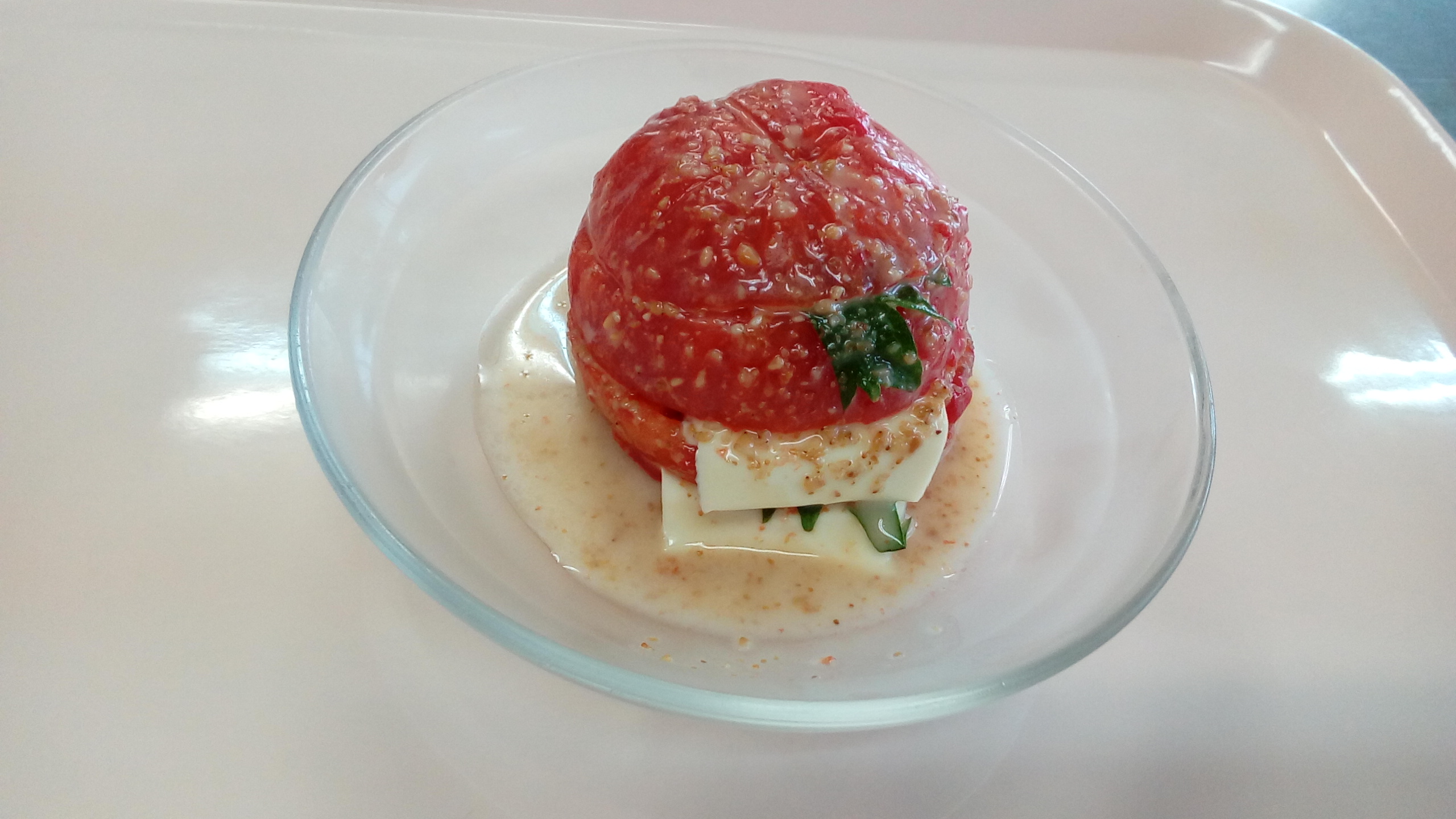 (1)お湯を沸かしておき、ヘタを取ったトマトを湯剥きする。皮をむいたら冷やしておく。