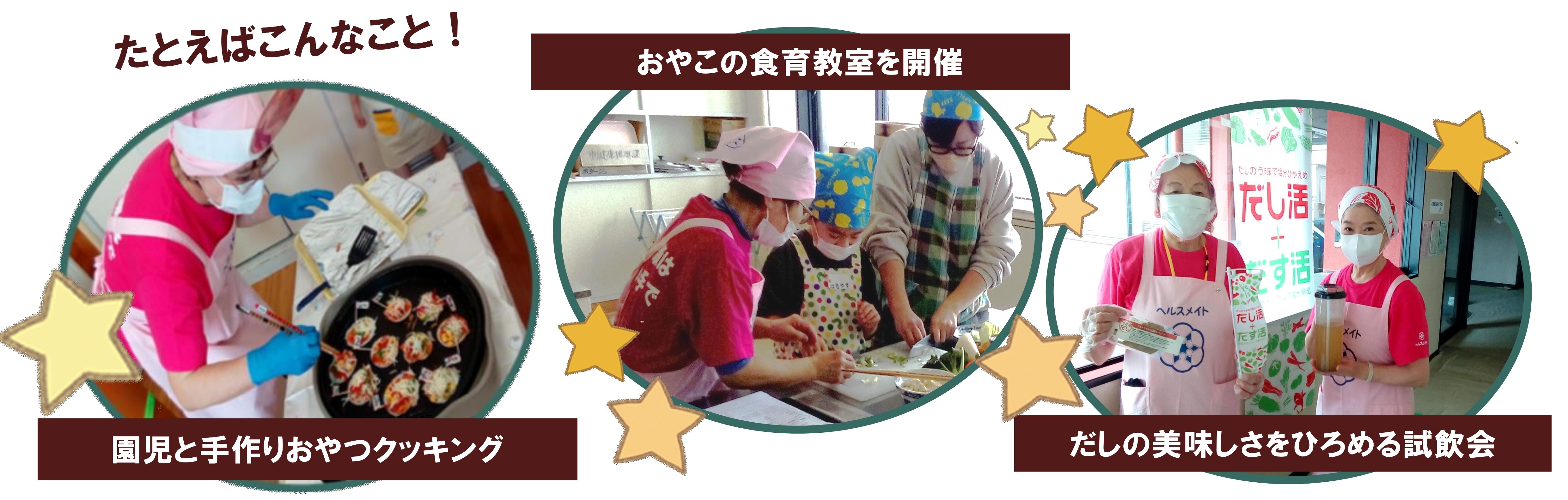 食生活改善推進員は、「私達の健康は私達の手で」をスローガンに、子どもからお年寄りまで幅広い世代に食の大切さを広める活動をしています。
