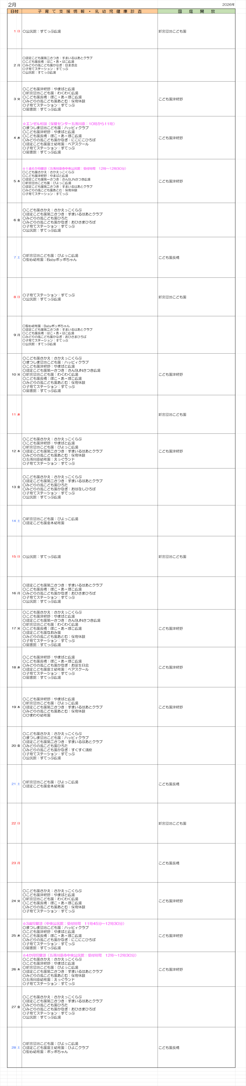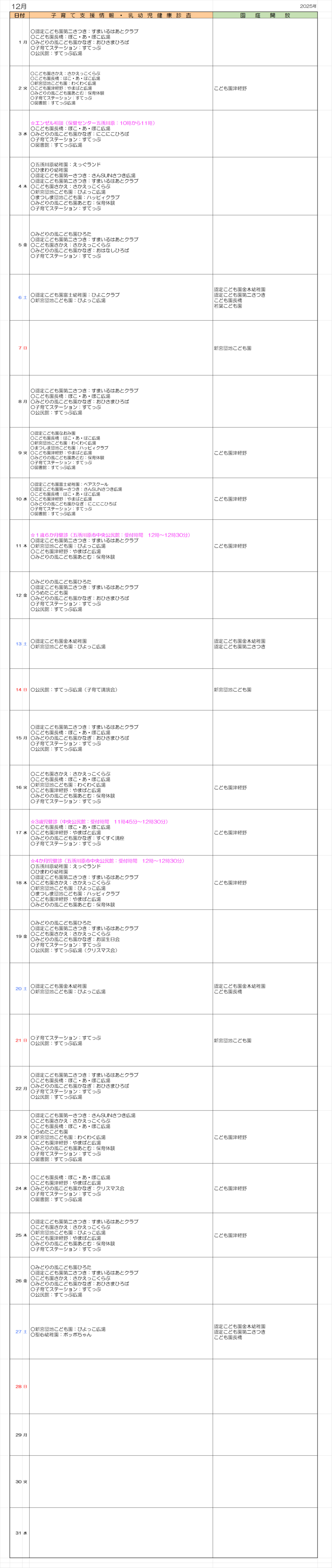 *子育て支援情報、園庭開放、乳幼児健康診査の行事カレンダーです。